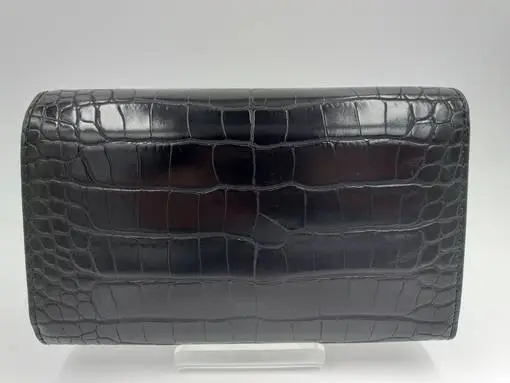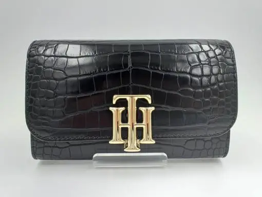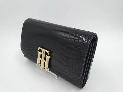 Tommy Hilfiger musta croco-kuosinen lompakko. Päällä tyylikäs, kultainen TH- logo.